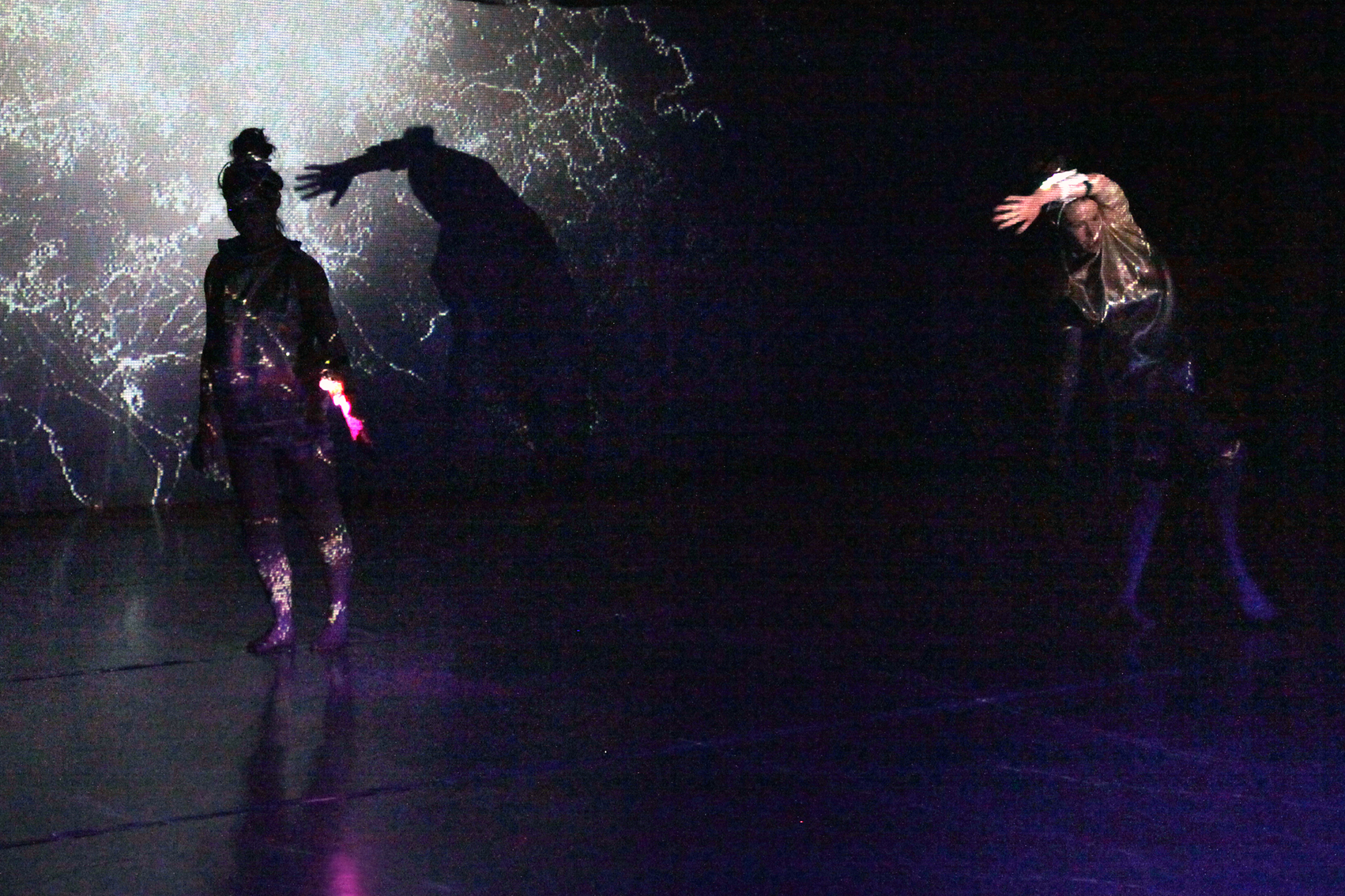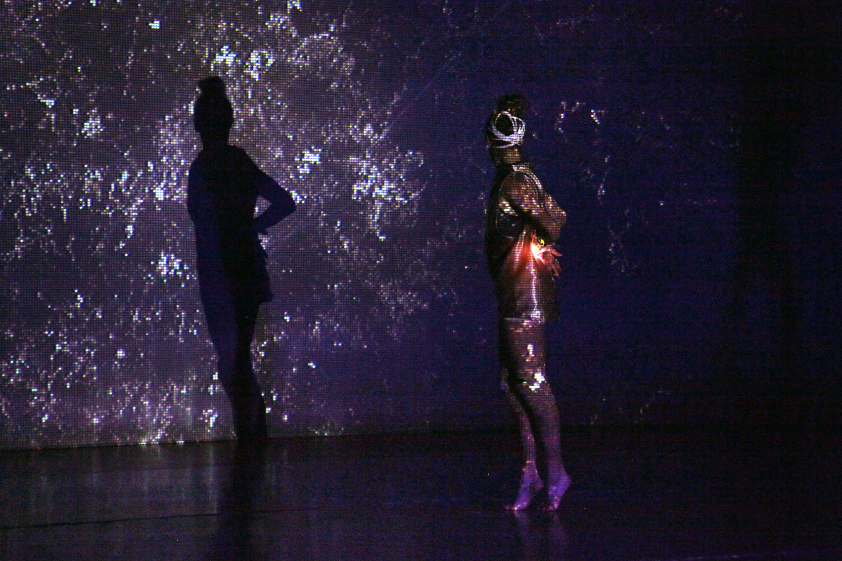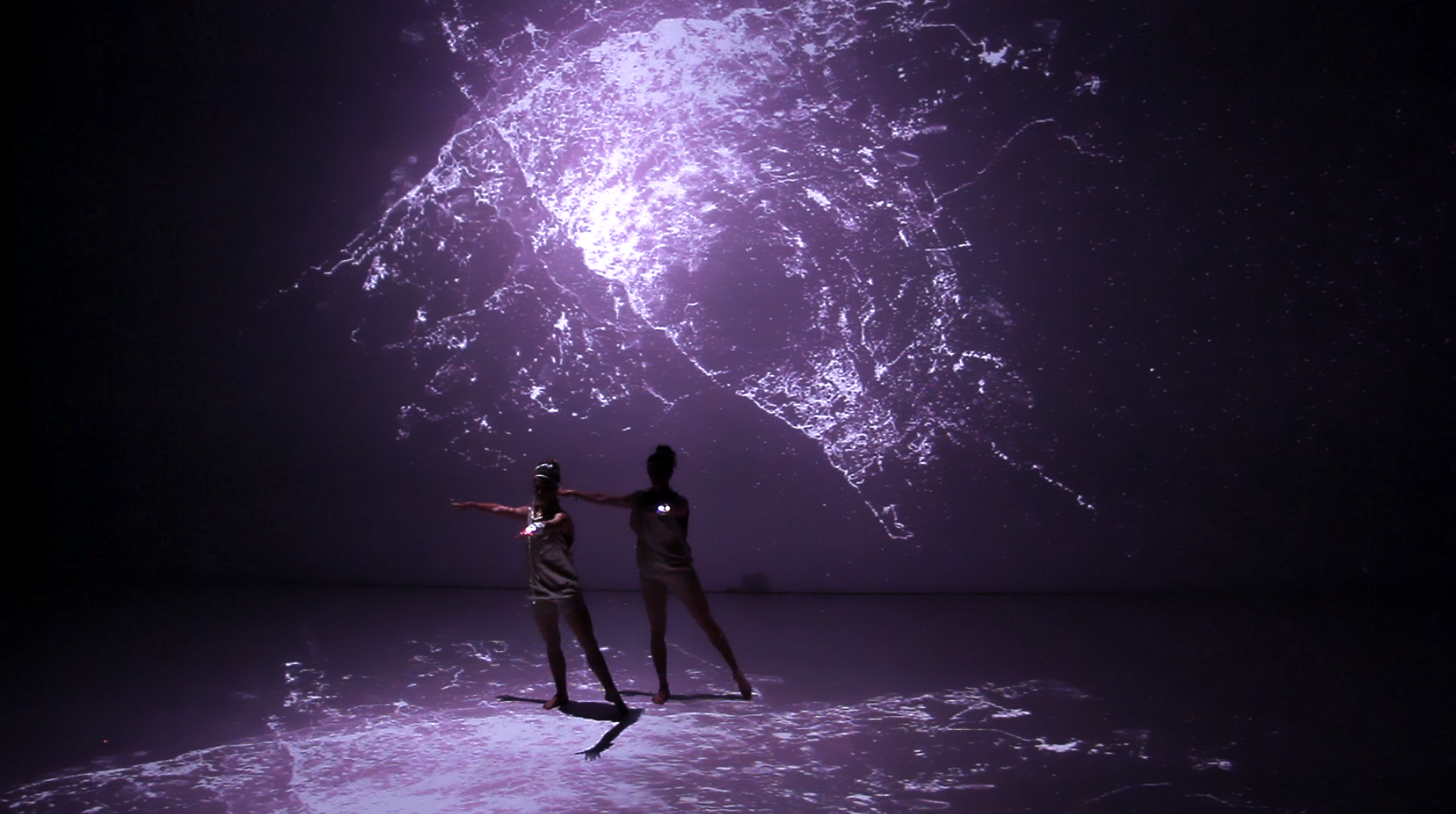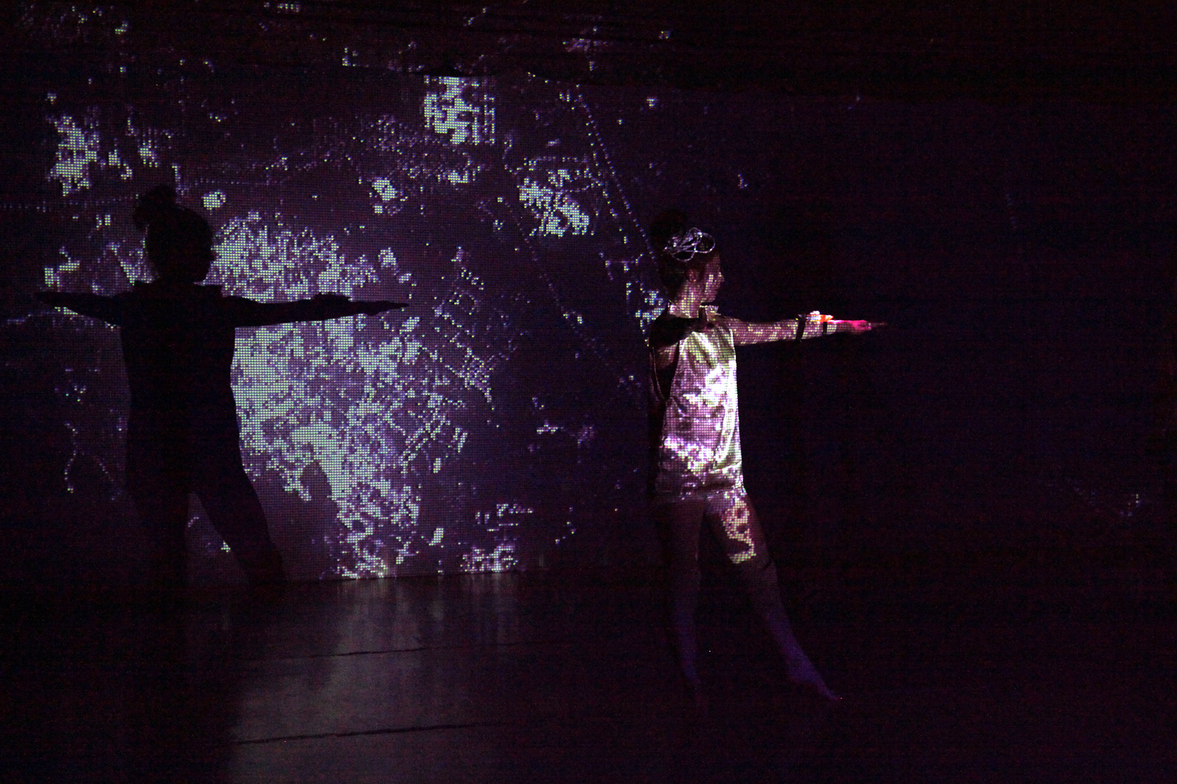 For the dual-screen projection a visualization of urban data and live composed sound is used. The dancers are equipped with wearable electronics which connect the movements directly with the visual and sound.